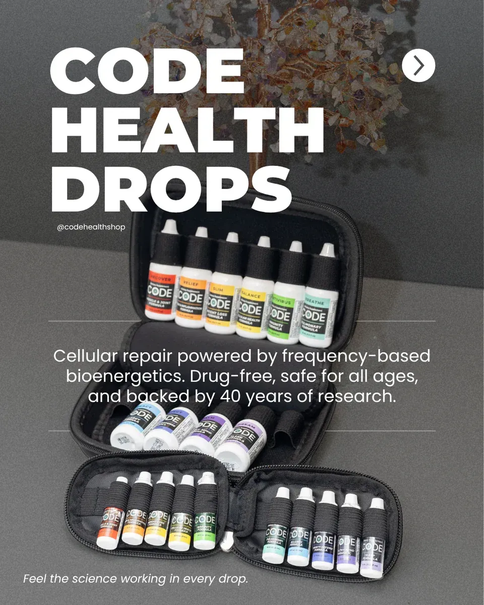 CODE Health offers bioenergetic drops made from digitized molecular codes programmed into saline. These formulas are backed by 40+ years of research and support the body in repairing cellular damage naturally.